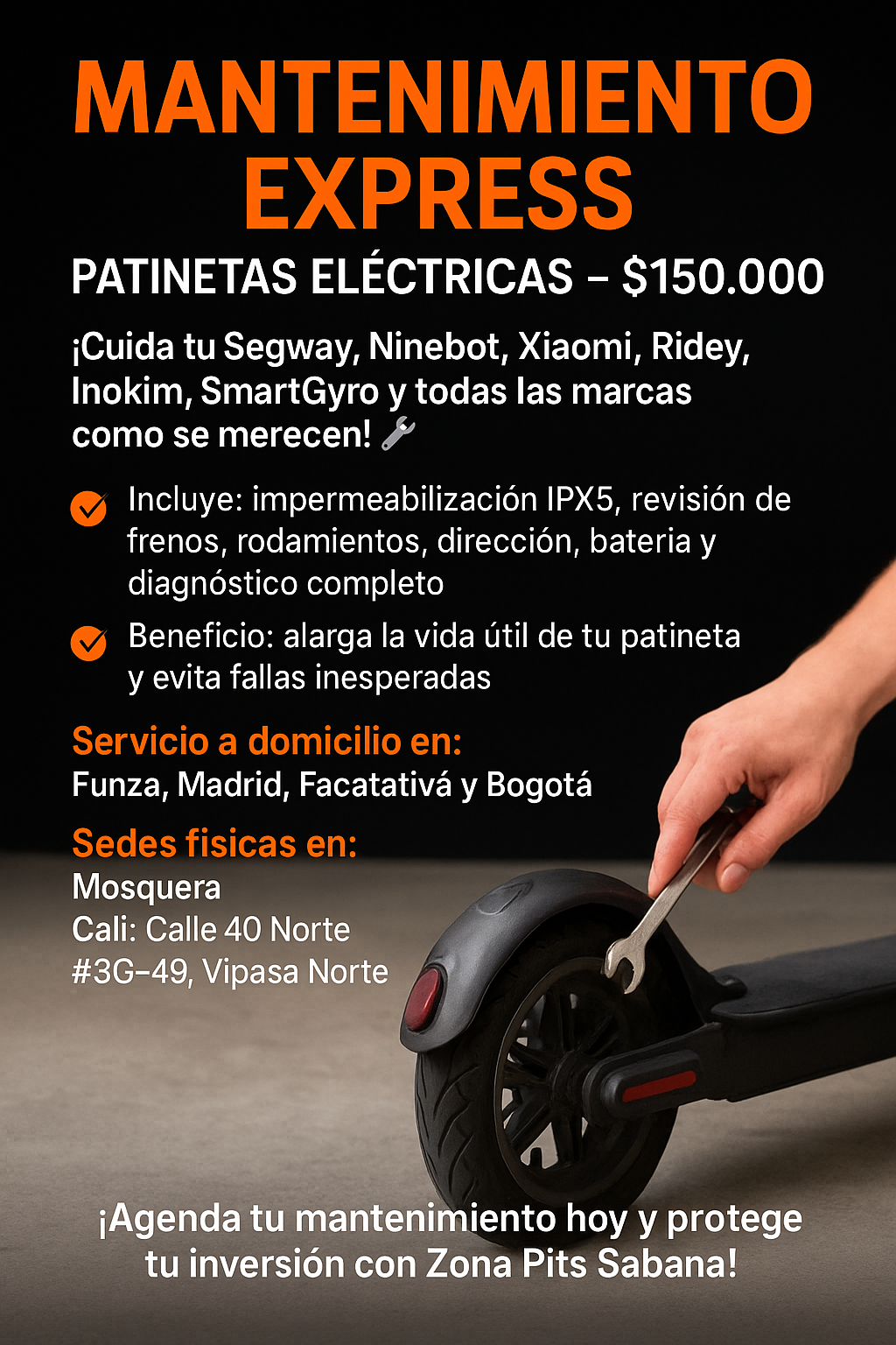 En Zona Pits Sabana entendemos que tu tiempo es valioso y que tu patineta eléctrica es más que un medio de transporte: es libertad, comodidad y movilidad inteligente. Por eso, hemos diseñado un servicio exclusivo de mantenimiento a domicilio, pensado para que no tengas que preocuparte por traslados ni largas esperas en talleres.
